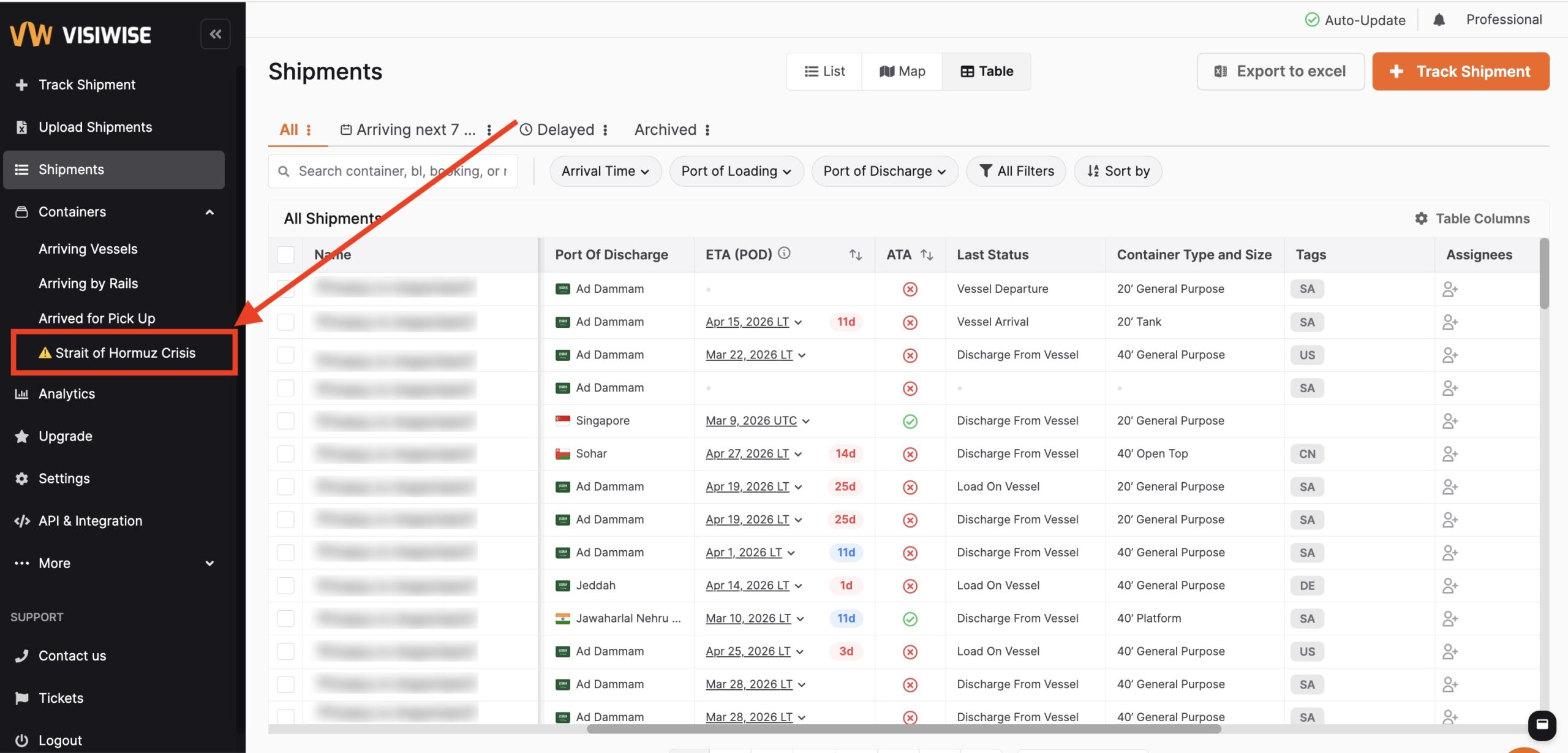 Visiwise automatically detects and flags containers in your portfolio whose routes pass through or near the Strait of Hormuz and the Red Sea danger zones.